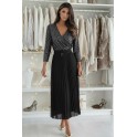 DisponibleRobe longue élégante avec haut croisé en sequins et jupe plissée fluide.